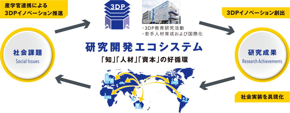 積極的な産学連携により、3DPの成果が世の中の安心、安全に貢献し、人々のウェルビーイングに寄与することを目指す。