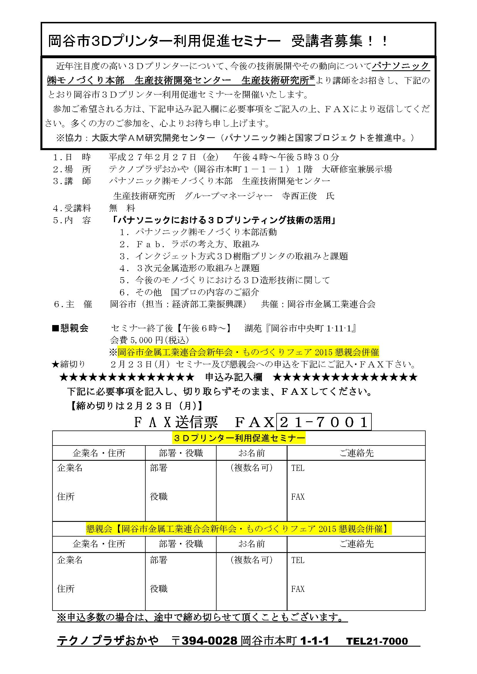 イベント 岡谷市3Dプリンター利用促進セミナー 日時:2014年2月27日(金) 午後4時~午後5時30分 場所:テクノプラザおかや(岡谷市本町1-1-1)1階 大研修室兼展示場 主催:岡谷市 共催:岡谷市金属工業連合会 協力:大阪大学 AM研究開発センター 岡谷市3Dプリンター利用促進セミナー(PDF) 記事参照 2015年02月27日