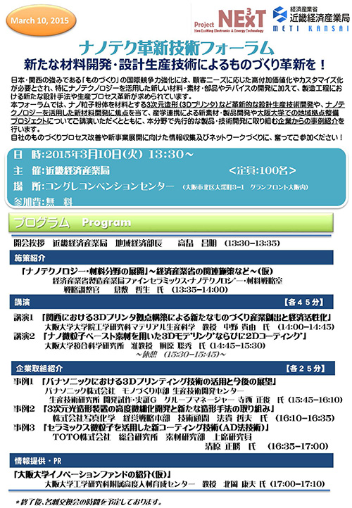 イベント ナノテク革新技術フォーラム 日時:2015年3月10日(火)13:30~ 場所:コングレコンベンションセンター(大阪市北区大深町3-1 グランフロント大阪内) [Download]ナノテク革新技術フォーラムイベントフライヤー(PDF) 記事参照 2015年03月10日