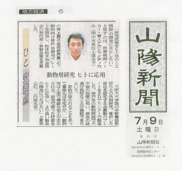 拠点の成果である粉体粉末協会・新技術新製品賞の記事が山陽新聞に掲載されました。(7月9日) 拠点の成果である粉体粉末冶金協会 平成27年度協会賞 新技術・新製品賞「電子ビーム積層造形法による伴侶動物骨折治療用アナトミカルプレートの開発」【詳細はこちら】の記事が山陽新聞に掲載されました。(7月9日) « 前の記事 次の記事 » ニュース一覧 2016年07月09日