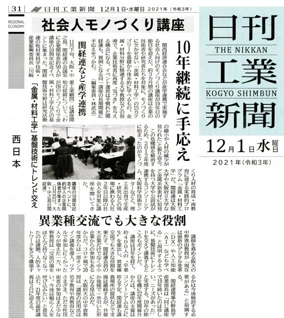 本日の日刊工業新聞に関西経済連合会の社会人モノづくり講座の10周年が紹介され、中野教授がコメントしています。 社会人モノづくり講座「10年継続に手応え、異業種交流でも大きな役割」:日刊工業新聞、31面(西日本)、2021年12月1日朝刊 « 前の記事 次の記事 » ニュース一覧 2021年12月01日