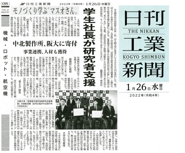 日刊工業新聞に記事が掲載されました。 学生社長が研究者支援 中北製作所、阪大に寄付、日刊工業新聞朝刊、8面(機械・ロボット・航空機)、2022年1月26日 写真:前列 右2人目 小笹助教 « 前の記事 次の記事 » ニュース一覧 2022年01月26日