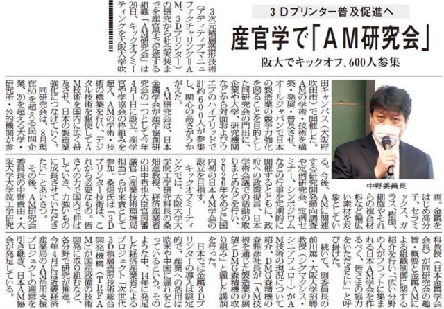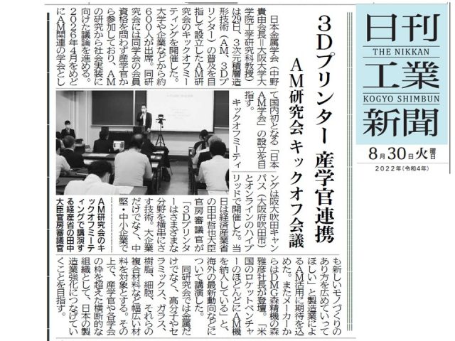 「3Dプリンター 産学官連携 AM研究会キックオフ会議」、日刊工業新聞、2022年8月30日.