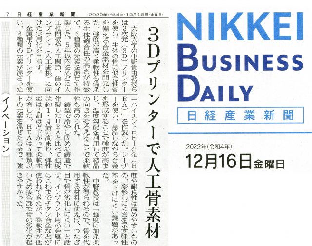 日経産業新聞に「3Dプリンターで人工骨素材」の記事が掲載されました。CREST ナノ力学領域「カスタム力学機能制御学の構築~階層化異方性骨組織に学ぶ~」の研究成果です。 3Dプリンターで人工骨素材、日経産業新聞、12月16日、7面イノベーション欄 « 前の記事 次の記事 » ニュース一覧 2022年12月16日