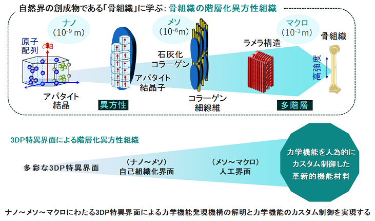 本研究は、こうした骨組織に学び、金属3Dプリンティングにより形成が期待されるナノ~マクロにわたる特異界面での強化機構を解明し、フィジカル空間とサイバー空間での解析の連携に基づく特異界面の自在な設計・導入により、力学機能を人為的にカスタム制御した革新的材料の創出を目指します。