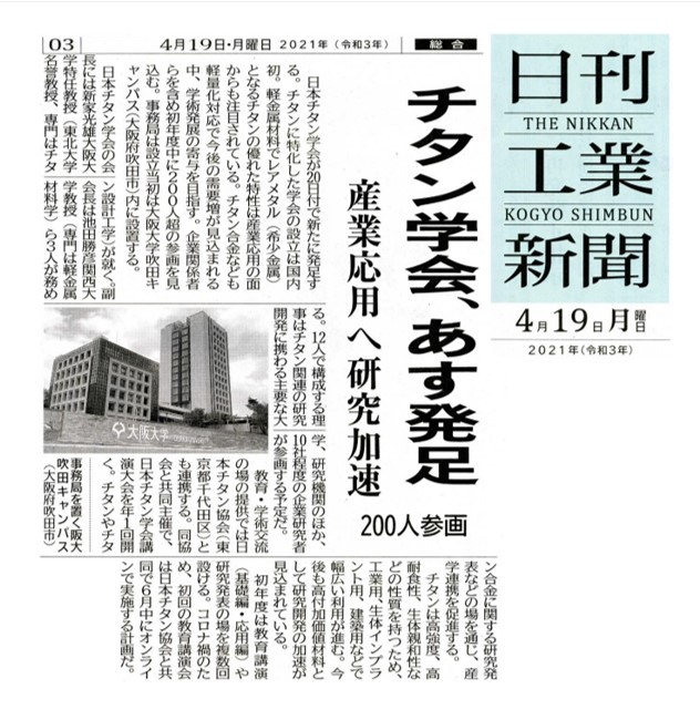 日本チタン学会発足 産業応用へ研究加速