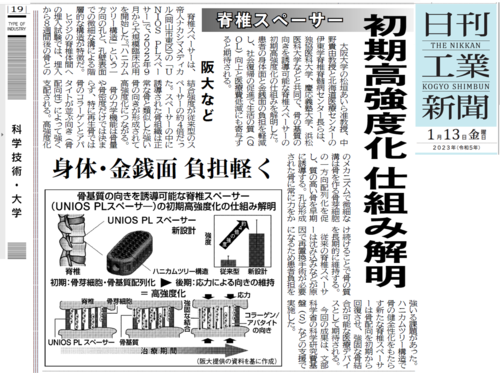 初期高強度化 仕組み解明 脊椎スペーサー 阪大など 身体・金銭面負担軽く
